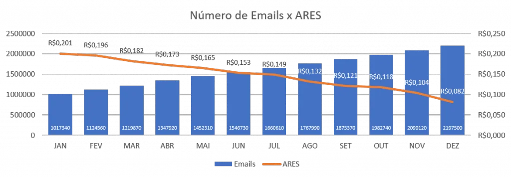Uma das formas mais interessantes de se usar esta métrica para tomada de decisão é fazer uma análise mais ampla comparando a evolução do ARES com o volume de e-mails enviados.